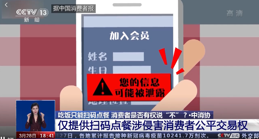 实际上,今年3月,中国消费者协会曾发文指出,仅提供扫码点餐涉嫌过度收集消费者个人信息、侵害消费者的公平交易权,不提供现场菜单有损消费者的知情权,新技术应用不应成为特殊消费群体的消费阻碍。餐厅经营者不提供人工点餐服务,只提供扫码点餐,不仅有违商业惯例,也使现场就餐消费者只能关注或绑定经营者的公众号或小程序,被动授权经营者获取其个人信息。这种做法涉嫌侵害消费者的公平交易权,是设定不公平、不合理的交易条件,对现场就餐消费者的一种强制交易行为。这个索权既包括过度采集,也包括超出了合法性、正当性和必要性的使用。因为点餐直接点就可以,没必要去收集到底谁在点餐,也没有必要注册会员。这是一个利用点餐作为借口进行过度索权的行为,本身也侵犯了消费者自由选择的权利。甚至有一些商家会通过这些信息给消费者发精准的广告。民法典也有规定,我们每个人都有安宁的权利,拒收广告也是我们的权利。(编辑:建军)
