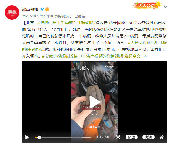 19日,店长回应补胎时扎破轮胎多收费称,