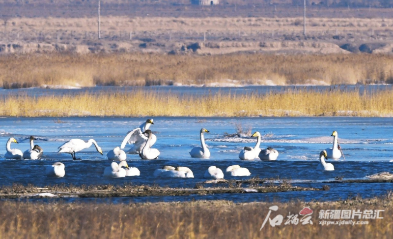 天鹅在柴窝堡湖栖息(资料图)。乌鲁木齐柴窝堡湖国家湿地公园管理处提供