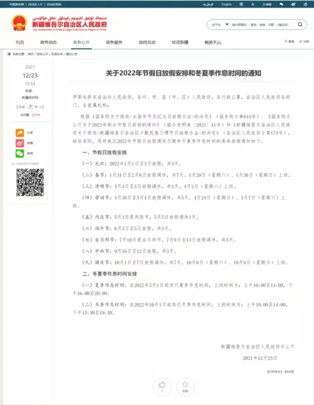 根据《国务院关于修改<全国年节及纪念日放假办法>的决定》(国务院令第644号)、《国务院办公厅关于2022年部分节假日安排的通知》(国办发明电〔2021〕11号)和《新疆维吾尔自治区人民政府关于修改<新疆维吾尔自治区少数民族习惯节日放假办法>的决定》(自治区人民政府令第174号),结合实际,现将我区2022年节假日放假调休日期和冬夏季作息时间的具体安排通知如下。