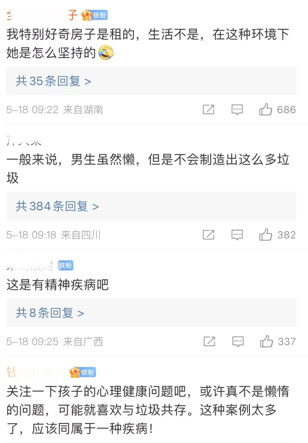 据报道:5月5日,在广东珠海,一女子房间垃圾堆成山,蟑螂不断往门外爬。
