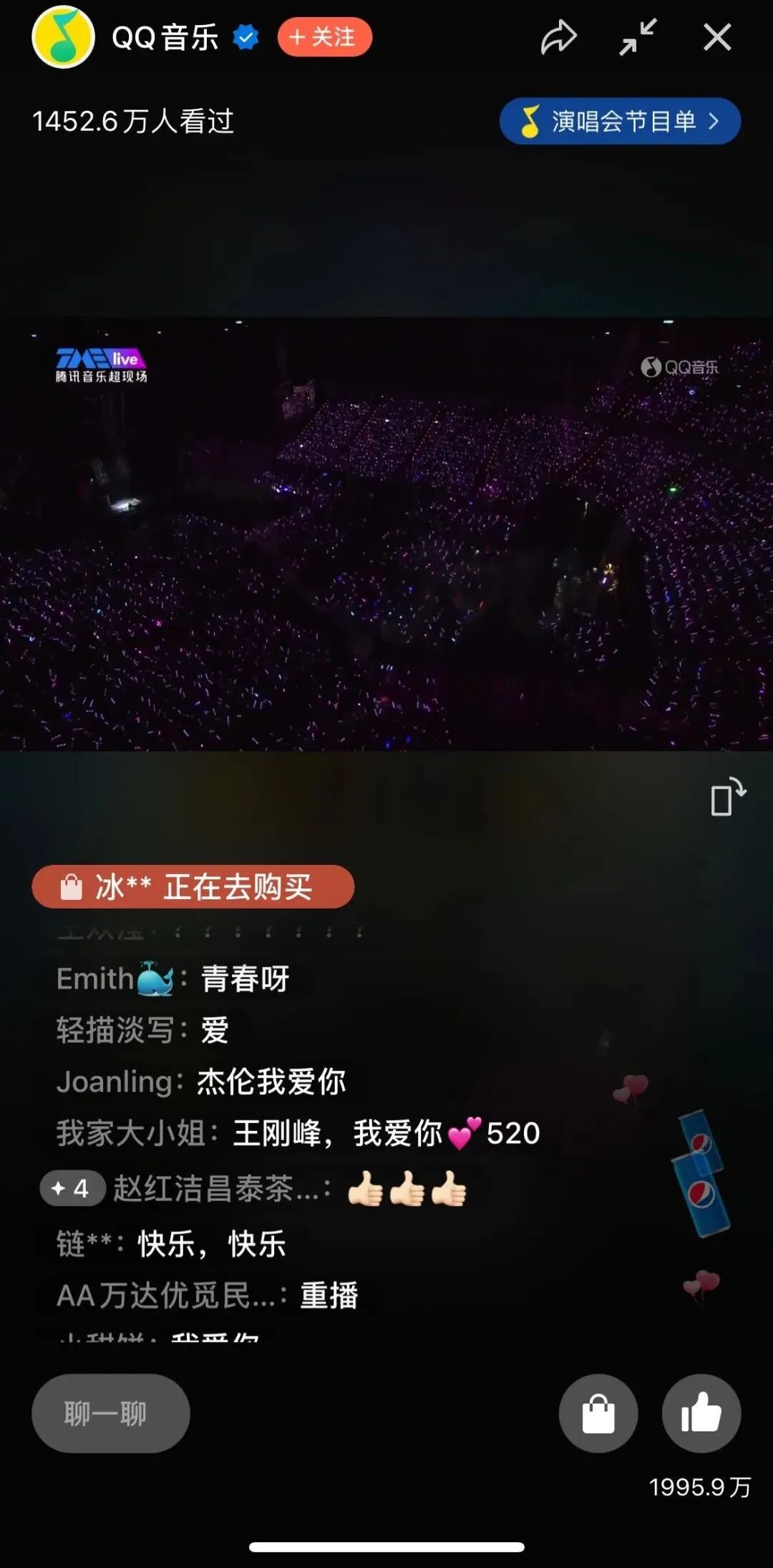 记者注意到,17日重映消息官宣后,周杰伦两场重映演唱会在12小时内于四平台(QQ音乐、酷狗音乐、酷我音乐、全民K歌)突破1000万预约人数。重映播出前10分钟,仅5月20日播出的魔天轮演唱会在QQ音乐单平台的预约人数就已突破776万,再加上明晚重映的周杰伦地表最强2019演唱会,两场演唱会在QQ音乐单平台的预约人数突破1542万人。5月20日晚8:50,演唱会重映开启50分钟之后,周杰伦2013魔天伦演唱会在微信视频号的观看次数已突破400万次;20分钟后的21:20,数据来到1452.6万人次;21:33,超过2041.3万人来过直播间;至21:40演唱会重映完结时止,一共有2243万网友在视频号点开过这场重映的演唱会。![]()