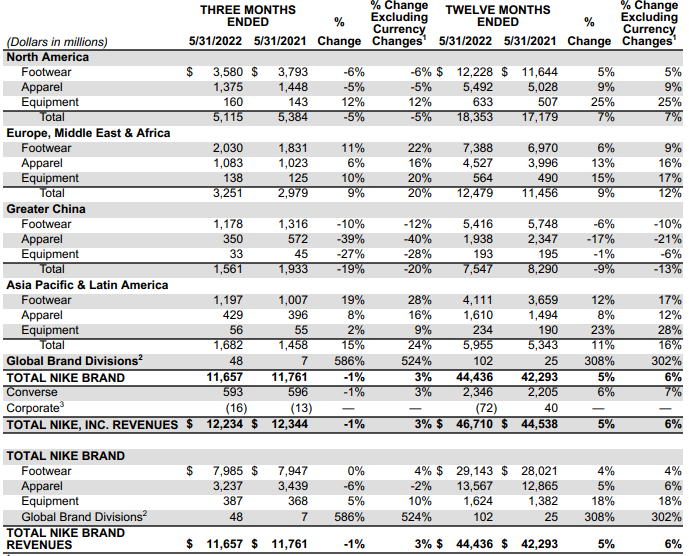 2022财年全年,耐克营收达467亿美元,同比增加5%。全年净利润同比增长6%,至60亿美元。
