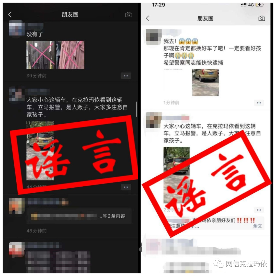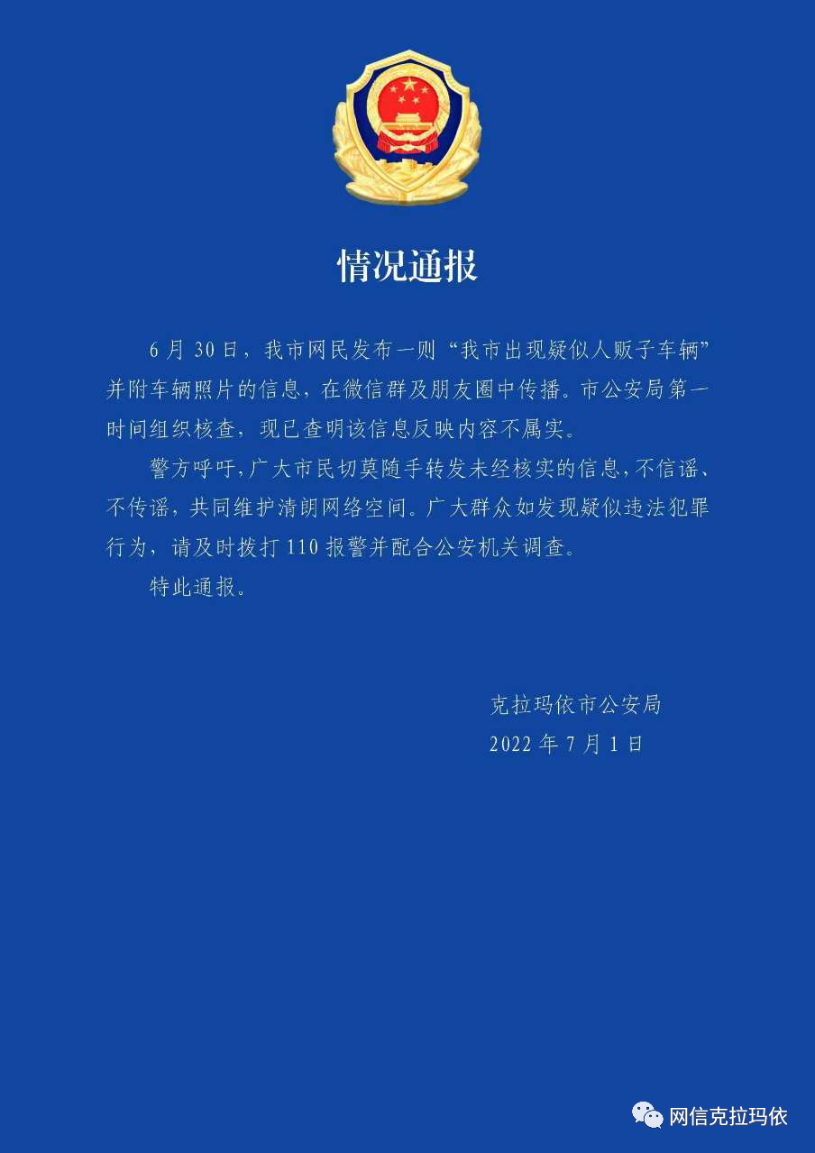 6月30日,克拉玛依市网民发布一则“我市出现疑似人贩子车辆”并附车辆照片的信息,在微信群及朋友圈中传播,造成一定恐慌。