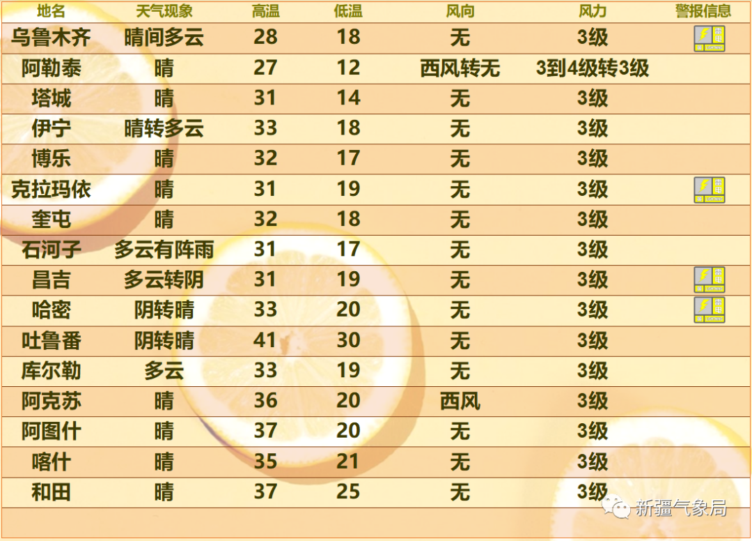 今天夜间到明天白天,北疆西部北部、天山北坡、天山山区、巴州北部、哈密市北部山区等地的部分区域有微到小雨,山区局部区域有中到大雨,上述区域伴有4~5级西北阵风,南疆盆地有5级左右偏东风,风口风力8~9级。南疆、东疆大部有35℃以上的高温天气,部分区域最高气温37℃以上,局部区域40℃以上;吐鲁番市局地气温达45℃。全疆其它地区以晴或多云天气为主,风力不大。