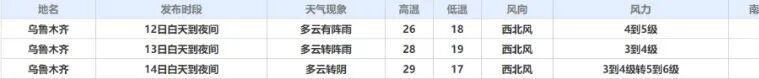 首府乌鲁木齐市 7月12日白天至夜间,小雨转多云,最高气温26℃,最低气温18℃,西北风4~5级。