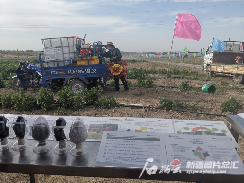 7月14日,在乌鲁木齐县水西沟镇平西梁村昆仑农场“零碳”农业科技示范园里,农业技术人员(右)正指导工人去除辣椒植株多余的枝杈。石榴云/新疆日报记者赵悦摄树莓地里工人正在进行喷洒作业。“喷洒的不是农药,是植物转光剂,可让作物提高光合作用能力,提高植株抵抗病害能力。”进行喷洒作业的工人介绍,喷施转光剂是促进作物成长的有机技术之一。![]()