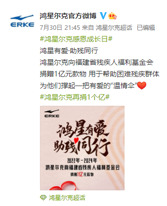 7月30日晚,在一场公益晚会中,鸿星尔克宣布一项公益捐赠。据其官博公告描述,此次捐赠包括了总价值为1亿元的物资和捐款,而该款物将被捐赠于福建省残疾人福利基金会,用于帮助困难残疾人和家庭改善生活质量。此前报道,去年河南水灾,鸿星尔克突然捐赠5000万元,引发公众购买狂潮。一时间,热搜、网红、出圈、爆单等词汇在这家公司身上频频显现,一次捐赠将其推到公众面前,知名度大幅提升,销售业绩迅速攀升。![]()