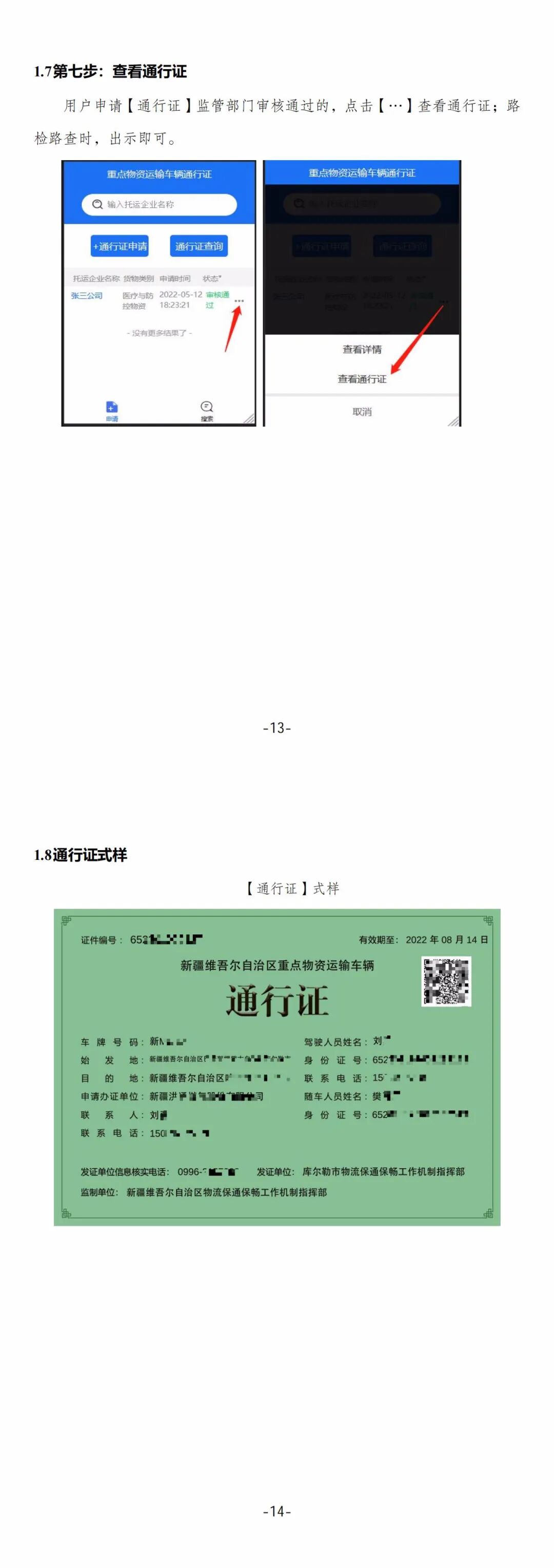 电子通行证遵循“应发尽发”原则,由保供企业和收发货单位作为托运人进行申领,通过“新疆交通运输”微信公众号或新疆交通运输厅网站,按流程填写相应信息申请成功后,即可查看、下载电子通行证,如遇检查时可通过扫描电子通行证右上方二维码方式对真实性进行查验。电子通行证实行“一车一线路一证”,确保司乘人员、车辆、运输线路信息与通行证相符,有效期内车辆可多次往返,方便重点物资运输车辆通行。![]()