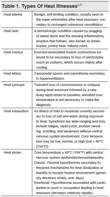 根据《美国户外医学协会指南( 2019 )》,中暑(heat illness)就被分为 6 种类型,主要根据临床症状及表现分为热水肿、热皮疹、热痉挛、热昏厥、热衰竭和热射病。