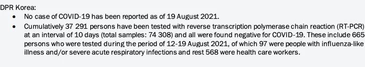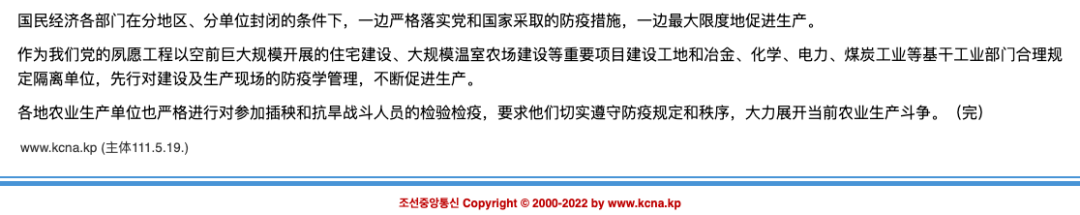 朝鲜未进行大规模的采样检测,2021 年 8 月,WHO 报告称,朝鲜境内累计有 37291 人接受了 PCR 检测,所有人员均呈阴性。这也是朝鲜为数不多的有关检测的报告。不足一年后, 2022 年 5 月 12 日朝鲜首次公开承认该国存在新冠病例,随后宣布升级为「最紧急防疫体系」,筛查全部发烧患者,由各级机关向居民派送药品。但防疫措施中,未有关于疫苗相关的信息。根据英国卫报报道,朝鲜已经彻底封锁了全国所有市县,居民出现了「囤货潮」。医生建议居民用盐水漱口预防感染,并在高热、头痛和肌肉关节疼痛的情况下服用不同的药物。朝中社还建议每天喝 3 次金银花茶或柳叶茶。但是,根据 19 日朝中社报道,朝鲜并未停工停产。住宅、农场建设以及农业都在进行中,冶金、化学、电力、煤炭工业等部门,划定隔离单位,按照防疫规定继续生产。朝中社称,隔离生产期间,氮肥生产增至 105%,电力较之前增产数百万千瓦时,水泥生产增至 110.2%,制鞋厂达 105%,制盐局以 110% 的成绩提前并超额完成了 5 月生产计划。朝中社 5 月 22 日称,「我国疫情传播状况,从初期的急速增加,转为减少趋势,得到稳定遏制和管控,在整个地区痊愈病例日益增多,保持积极势头。」并署下新闻标题:「充满对防疫大捷的坚定信念」。朝鲜人口约 2500 万,未有注射疫苗等信息。联合国人道主义事务协调厅研究员 Boram Jang 就此呼吁,「朝鲜政府应立即制定计划,与国际社会合作,为其民众提供疫苗。政府现在必须采取行动,保护这些世界上获得疫苗最少、活在最脆弱的卫生系统的人们。」约翰霍普金斯大学健康安全中心在 2019 年曾以 Prevent(预防)、Detect(检测)、Respond(响应)、Health(医疗)、Norms(规范)、Risk(风险)六项作为指标,进行各国应对流行病的能力的研究,全球平均得分约 39 分,朝鲜最终得分约 19 分,在 195 个国家中排名第 193。图源:Johns Hopkins Bloomberg School of Public Health另一项柳叶刀的调查表明,朝鲜目前每万人的医护人员比例为 4.9,从 1990 年至今几乎没有变化。而中国这一数字,从 1990 年的 10.0 已升至 27.2。英国南安普顿大学全球健康高级研究员 Michael Head 也表示,朝鲜并没有能力应对新冠疫情大爆发。Head 认为,朝鲜未有疫苗接种计划,且目前有超过 1000 万人营养不良,会增加重症的风险。他认为,另一个风险因素是年龄较大。据估计,朝鲜有 10% 的人口年龄在 65 岁以上,另外大约 19% 的人口年龄在 50~64 岁之间。因此,一旦感染有很多人可能会发展为重症。同时,朝鲜的医疗水平发展不均,尤其在远离平壤的偏远地区,一旦爆发疫情会不堪重负。Head 表示,这将对其他医疗领域产生连锁反应,进一步限制获得非传染性疾病救治的机会。「目前的封锁可能至少为朝鲜争取一些时间,来实施其他公共卫生措施,例如接种疫苗。」参考资料: