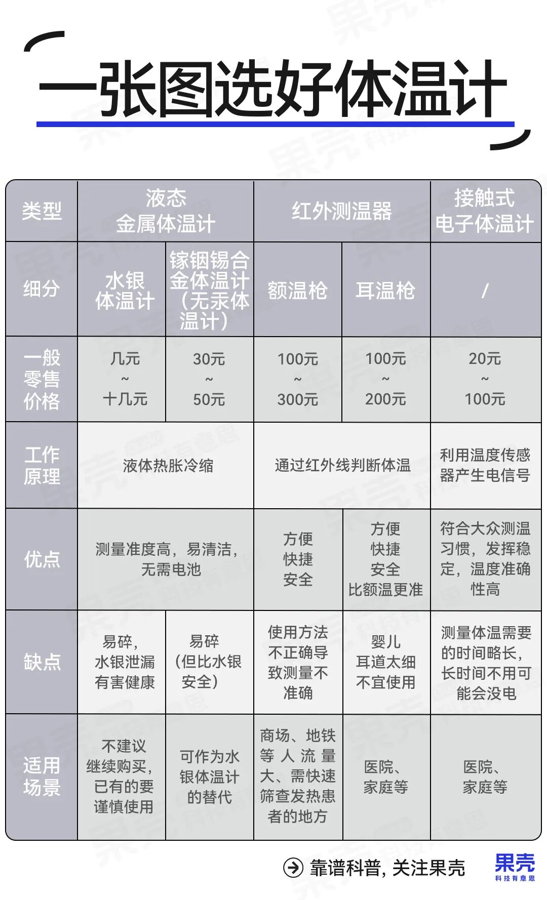 总的来说,可以根据个人需求选择体温计,但家庭使用,出于安全性和准确性的考量,一般更推荐使用电子体温计和耳温枪(6个月以下小婴儿不适用)。
