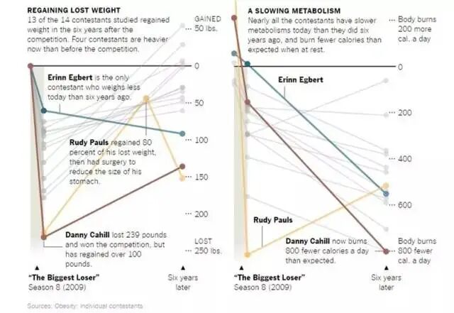 最惨的是,掉下去的体重反弹了,掉下去的静止代谢率(resting metabolic rate)却没反弹——这些人基本得每天少吃一顿饭,才能阻止自己继续发胖。