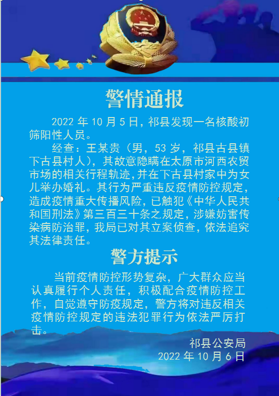 经查:王某贵(男,53岁,祁县古县镇下古县村人),其故意隐瞒在山西太原市河西农贸市场的相关行程轨迹,并在下古县村家中为女儿举办婚礼。其行为严重违反疫情防控规定,造成疫情重大传播风险,已触犯《中华人民共和国刑法》第三百三十条之规定,涉嫌妨害传染病防治罪,该局已对其立案侦查,依法追究其法律责任。