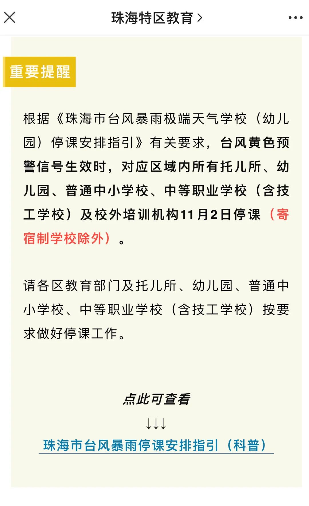 据珠海教育局官方消息,珠海市气象局已于11月1日20时00分将台风预警信号升级为黄色。对应区域内所有托儿所、幼儿园、普通中小学校、中等职业学校(含技工学校)及校外培训机构11月2日停课(寄宿制学校除外)。