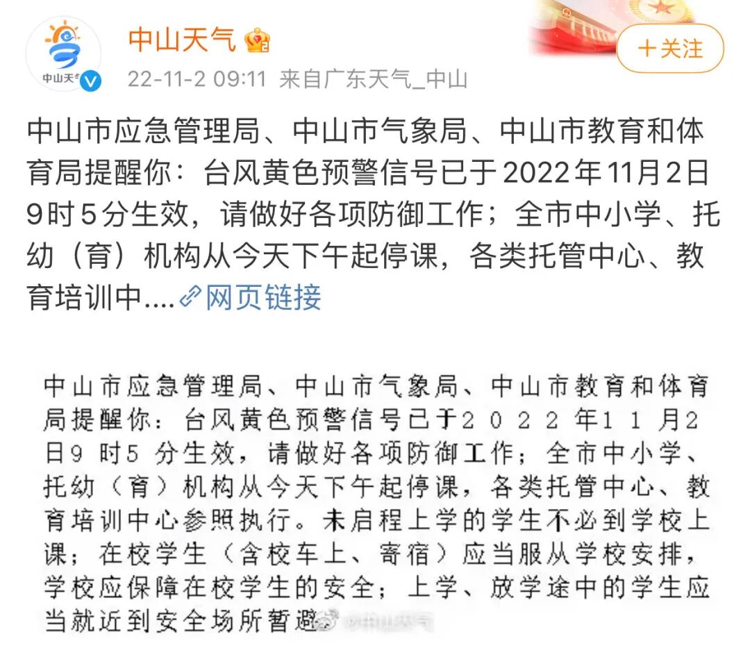 据@中山天气:台风黄色预警信号已于2022年11月2日9时5分生效,全市中小学、托幼(育)机构从今天下午起停课,各类托管中心、教育培训中心参照执行。