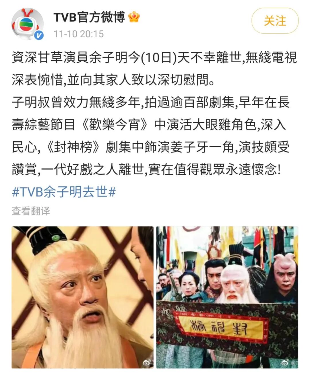11月10日,前东家TVB发文悼念余子明。悼文称,资深甘草演员余子明10日不幸离世,TVB深表惋惜,并向其家人致以深切慰问。余子明效力TVB多年,拍过逾百部剧集,早年在长寿综艺节目《欢乐今宵》中演活“大眼鸡”角色,深入人心。《封神榜》剧集中饰演姜子牙一角,演技颇受赞赏。一代好戏之人离世,实在值得观众永远怀念。
