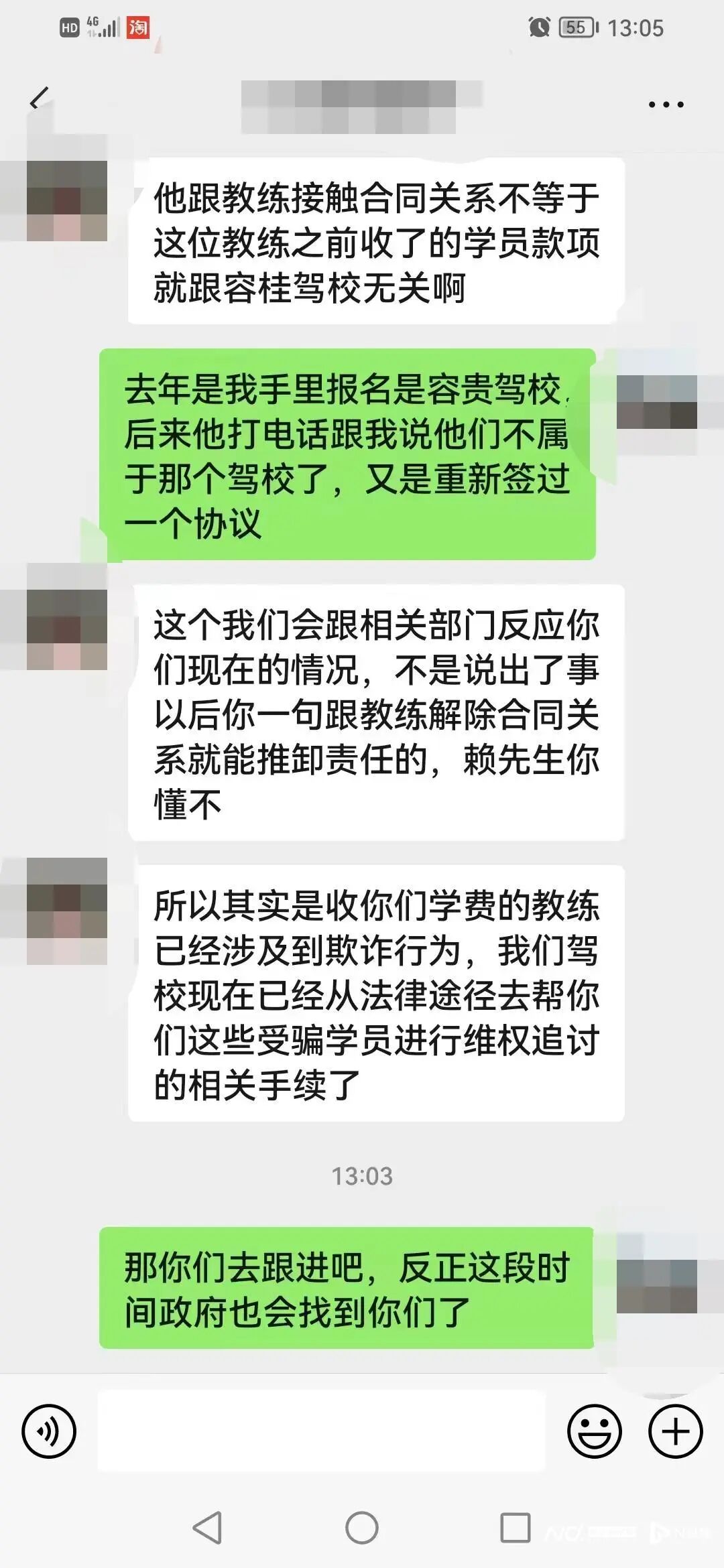 阿强与大众驾校工作人员的聊天截图