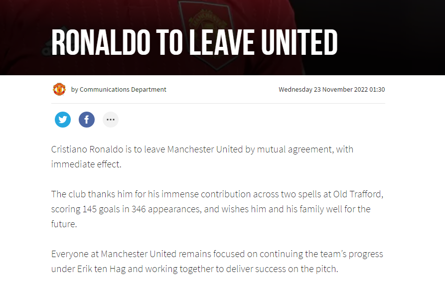 曼联官方同时宣布,俱乐部感谢C罗在两次效力曼联期间为俱乐部做出的贡献。目前C罗正在跟随葡萄牙国家队备战卡塔尔世界杯的比赛。