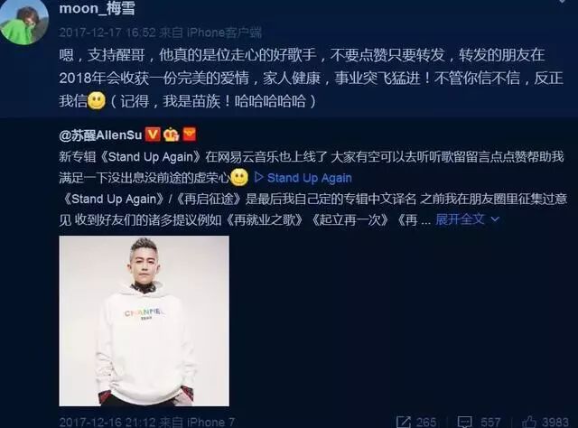 在追溯到更久以前,发现两人不仅是在今年,早在2017年时,这位梅雪同学就在微博上转发了苏醒的发新专辑的微博,并送上了自己的祝福。所以两人这是默默在一起快一年了?