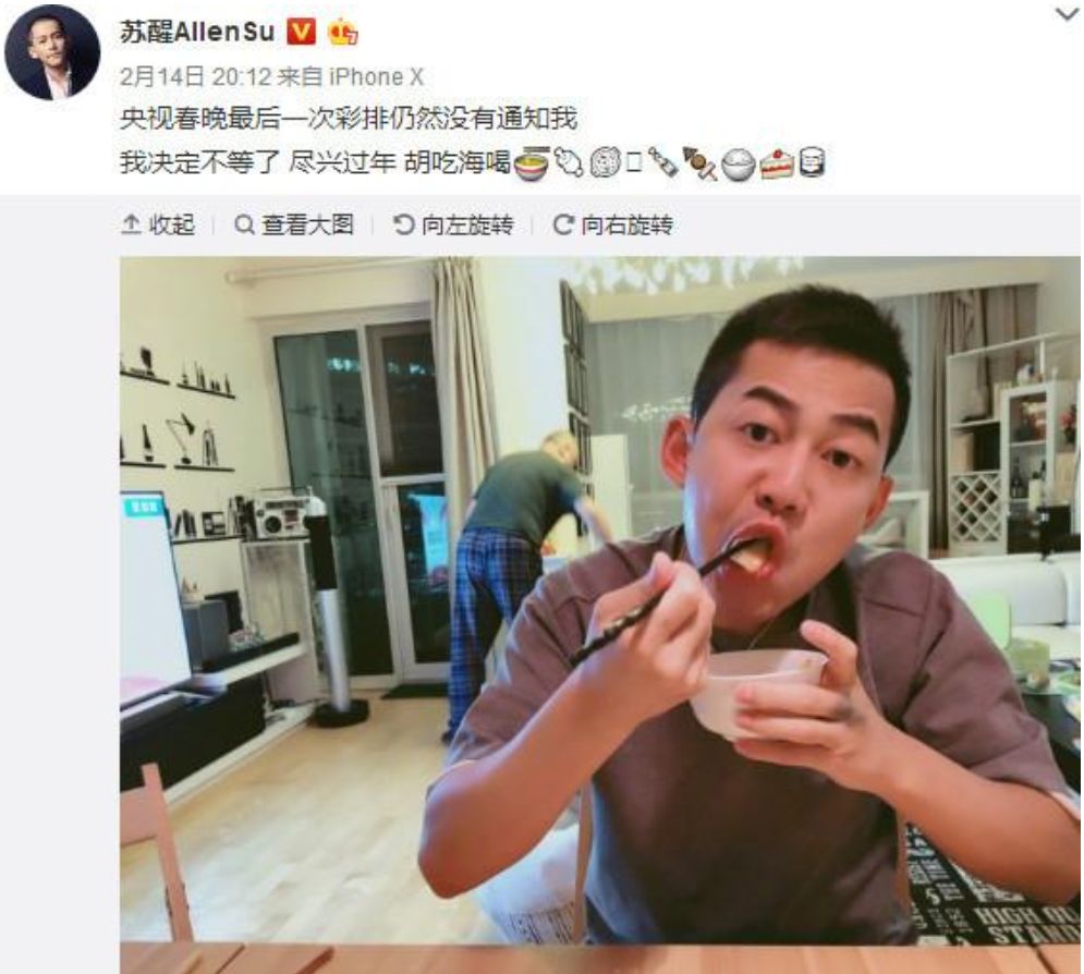 反观那时的苏醒,因为没有上央视春晚,还在微博上晒自己胡吃海塞的照片,仿佛单身一人,看不出一点恋爱的痕迹。