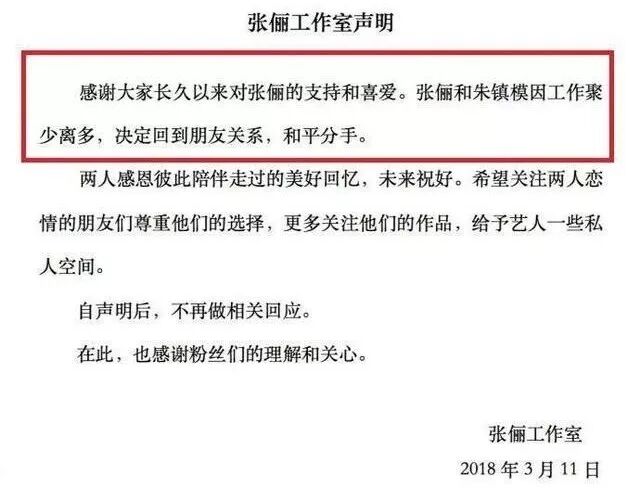 这段恋情在公开3个月后宣布终结,张俪在分手前就说过从认识到见父母不到100天,这种发展速度是不正常的。