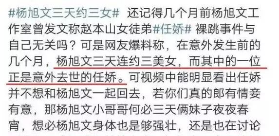 事后有人爆料任娇坠楼当晚和杨旭文在同一个房间,两人虽不是情侣关系但有过亲密行为。