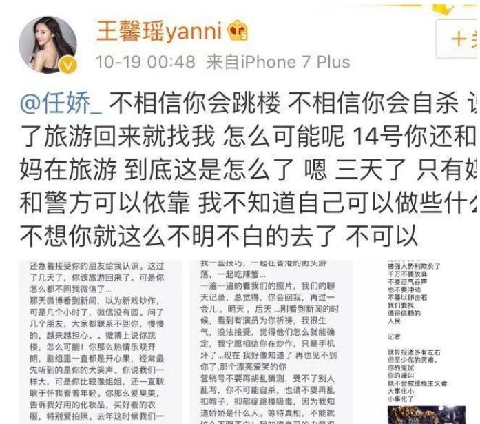 一开始网上有传言说任娇是抑郁症自杀,但是看朋友的爆料和任娇的朋友圈,不像是会自杀的。