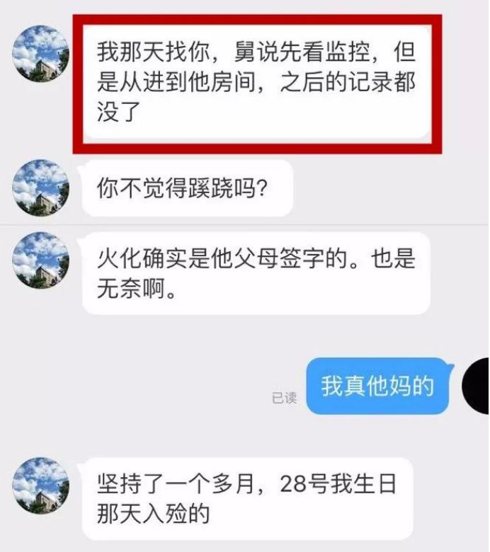 任娇表姐跟其好友的聊天记录显示,任娇进入杨旭文房间之后的监控都没了。