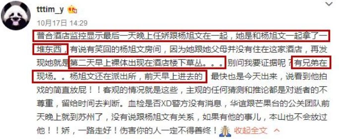 任娇一位好友,还直接点名说,杨旭文是任娇生前喜欢的男生,在他房间出了意外,应该站出来说清楚。