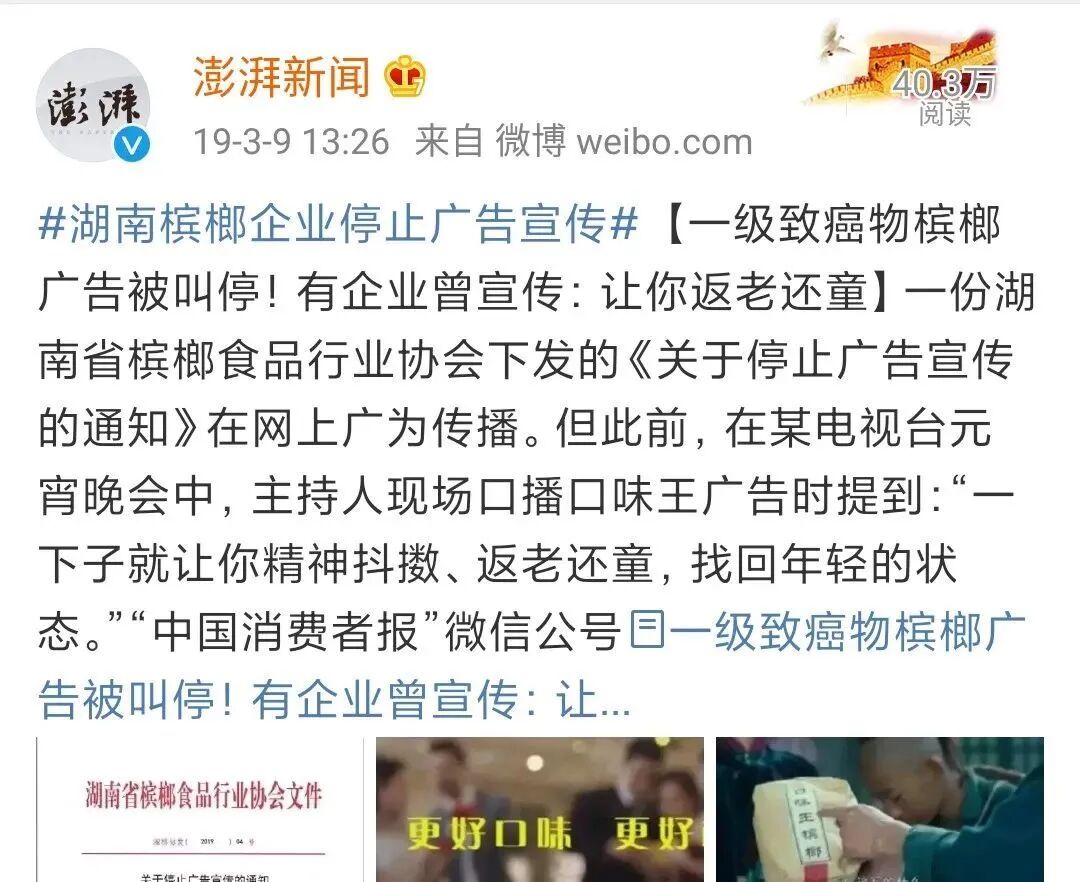 同年,湖南省槟榔食品行业协会下发了《关于停止广告宣传的通知》。