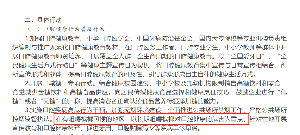 2019 年,国家卫健委在《健康口腔行动方案(2019~2025 年)》中提到,要在有咀嚼槟榔习惯的地区,重点宣传长期咀嚼槟榔对口腔健康的危害。