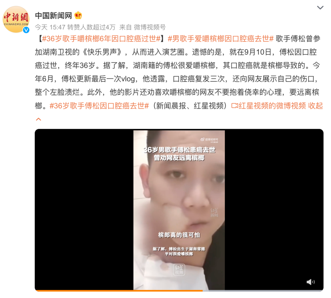 在傅松去世之前,他曾在视频中直接袒露自己的伤口,面部溃烂,声音沙哑,直指自己的口腔癌是因为吃槟榔导致的,他说: