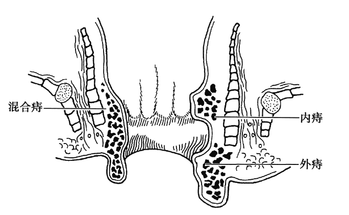 皮肤与直肠黏膜交界处有一条锯齿状的环状线,医学上称这条线为齿状线。痔疮以齿状线为界分为三类:内痔、外痔、混合痔,具体位置见下图。