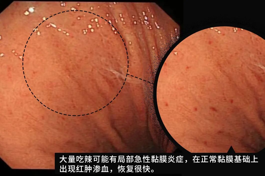 如果吃辣过于放飞,黏膜局部可能有红肿渗出血点变化,还会刺激胃液大量分泌,让人有恶心呕吐、腹泻等不舒服。但这通常是一过性的,会恢复。