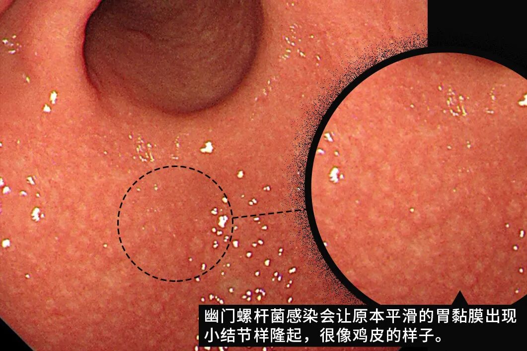 有时候给幽门螺杆菌感染者进行胃镜检查,就能看到这样典型的「鸡皮胃炎」变化,黏膜好像鸡皮肤一样。