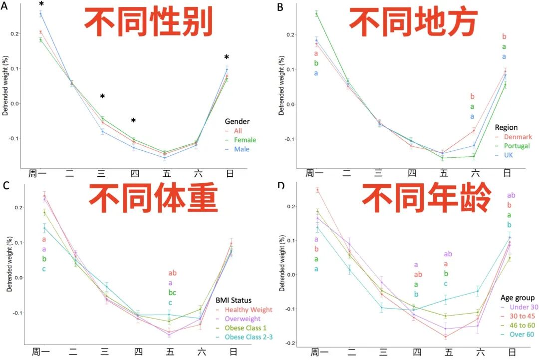 研究人员找了 80 多名参与者,收集记录了他们 80 天的体重变化,结果发现一个有趣的周波动数据: