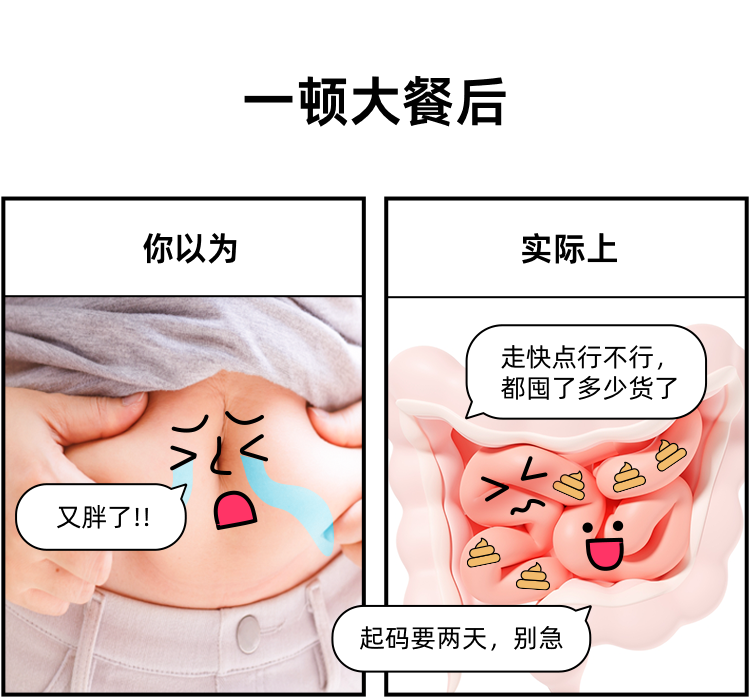 一顿吃到撑的大餐,也可能给体重带来影响:在接下来的 2~3 天里会重一点,主要因为食物残渣会在身体里积攒一段时间才能排出 💩(没错,30~60 个小时都是正常的)。