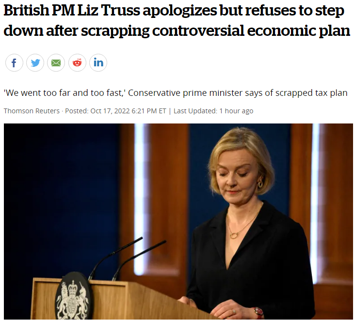 此后,特拉斯本人接受英媒采访时又表示,她为行动“冒进且过快”负责,她希望“对之前犯下的错误说抱歉”。特拉斯说,她依然致力于打造一个税率低、增长高的经济体,但保持经济稳定将是“优先要务”。