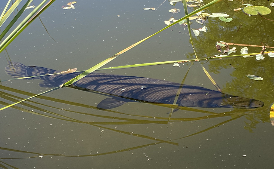 不过,鳄雀鳝食量不止于此,它的出现已经对小池塘的生态造成了破坏,原本池塘里喂养的小锦鲤数量至少没了3/4。