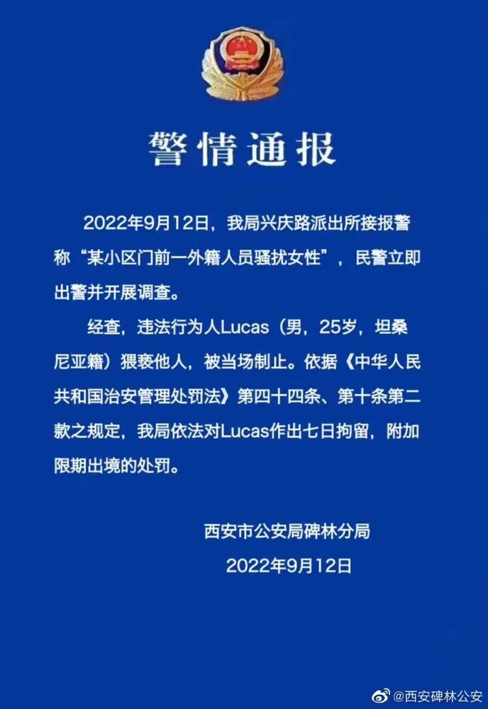 9月12日晚,西安市公安局碑林分局发布警情通报:9月12日,我局兴庆路派出所接报警称“某小区门前一外籍人员骚扰女性”,民警立即出警并开展调查。