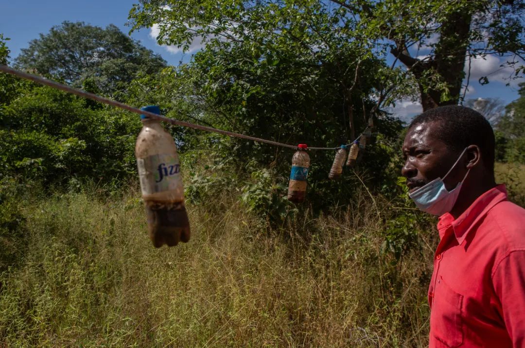 从全球范围来看,由于非法猎杀、栖息地减少等原因,亚洲象的数量在过去的一百年里下降了90%。与此同时,中国境内的亚洲象数量从上世纪70年代的146头上升到如今的300多头。这是一份难得的成绩,这其中有法律法规的贯彻落实,有各种社会力量的协调一心,但其中承受最多、也最容易被外界忽略的一群人是,生活在亚洲象栖息地周边、与那些庞然大物共享土地和水源,也共享矛盾和恐惧的当地村民。WWF(世界自然基金会)北京代表处森林项目主任黄文彬长期跟踪我国各区域森林保护和研究工作,在他看来,不管是西双版纳等地的人象冲突,还是这两年全球范围内人与野生动物之间的各种遭遇,关键问题在于,人类在设立保护区过程中,往往忽略了缓冲区的建设,「需要有一定的缓冲区,就动物和人的缓冲区,不要交叉得太厉害。」但现实的情境是,大象面对的是一个一再破碎的家园,而当地老百姓的生活叠加在这破碎之上,人和象被动卷入一场对彼此来说都算不上舒适的生存战争。早年在普洱调研时,张立拍过一张老乡家柴门的照片,照片上写着两首打油诗,其中一首是,「记者采访不见钱,象灾一年又一年,何日等到圣旨到,宰了大象好过年。」这些年演讲或是接受采访,张立总是提起打油诗的故事。最近十多年,张立也一直试图在老百姓的生计需要和濒危物种保护之间找到一个平衡点。但是这个平衡点,远非一个研究团队或是社会组织有能力解决的,「永远杯水车薪。」普洱市林草局野生动物和湿地保护科科长周智韬想了很多办法缓解当地的人象冲突问题,他自己画图纸在普洱建了防象塔,还规划了4000亩地的大象食堂项目。但长久的困难在于资金,2017年,他就普洱当地野生动物肇事补偿做过测算,按照当年的保险价格,如果实现老百姓损失的全覆盖,至少需要投入七千万资金,但是目前在「地方政府已经尽了全力」的情况下,每年的投入只有2000万,这意味着即使有保险公司兜底,当地百姓自己还是要承受超过三分之二的损失。陶庆刚参加工作的时候,有年水稻要丰收了,保护区边缘一个阿婆家的地被大象糟蹋,「那个阿婆坐在田边哇哇大哭。」野生动物肇事补偿制度推广之前,矛盾更加激烈,陶庆那时主要靠挨骂缓解老百姓的情绪,「老百姓坐在庄稼边上那种哭泣的样子,那种无奈的样子,就在那里骂我们,但是我们也只能忍着,你有什么办法?」 在津巴布韦,农民用香草、辣椒、生姜和发酵数周的鸡蛋自制混合物装在瓶子里,用来熏走大象、保护庄稼 图源视觉中国