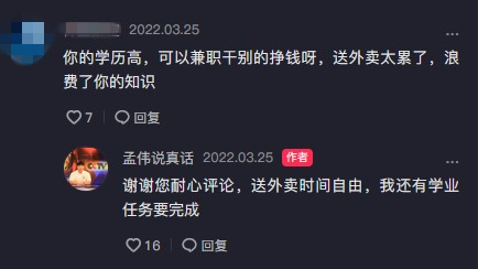 自从兼职送外卖以来,孟伟一直面临争议,有人认为送外卖浪费了他的知识,提出以他的学历有更好的去处,也有人质疑他这样做是为了博眼球。![]()