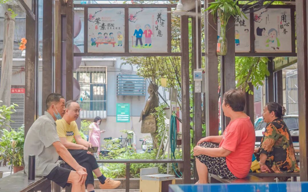 居民在社区纳凉驿站话家常