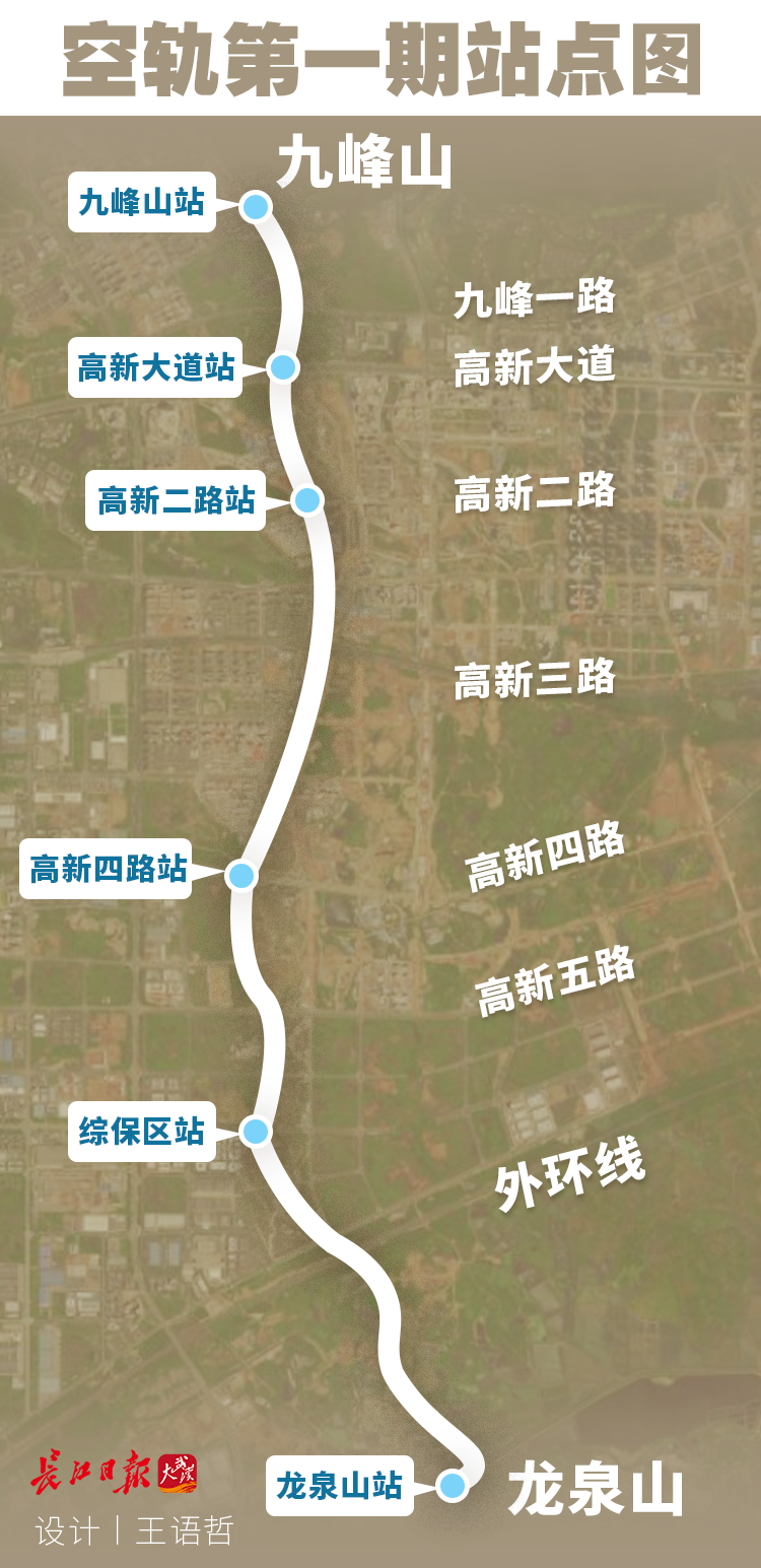 光谷空轨旅游专线一期线路全长约10.5km,起于光谷四路森林动物园附近,止于龙泉山。主要工程内容为全线高架桥梁,设车辆基地一处,车站6座,分别为九峰山站、高新大道站、高新二路站、高新四路站、综保区站、龙泉山站。