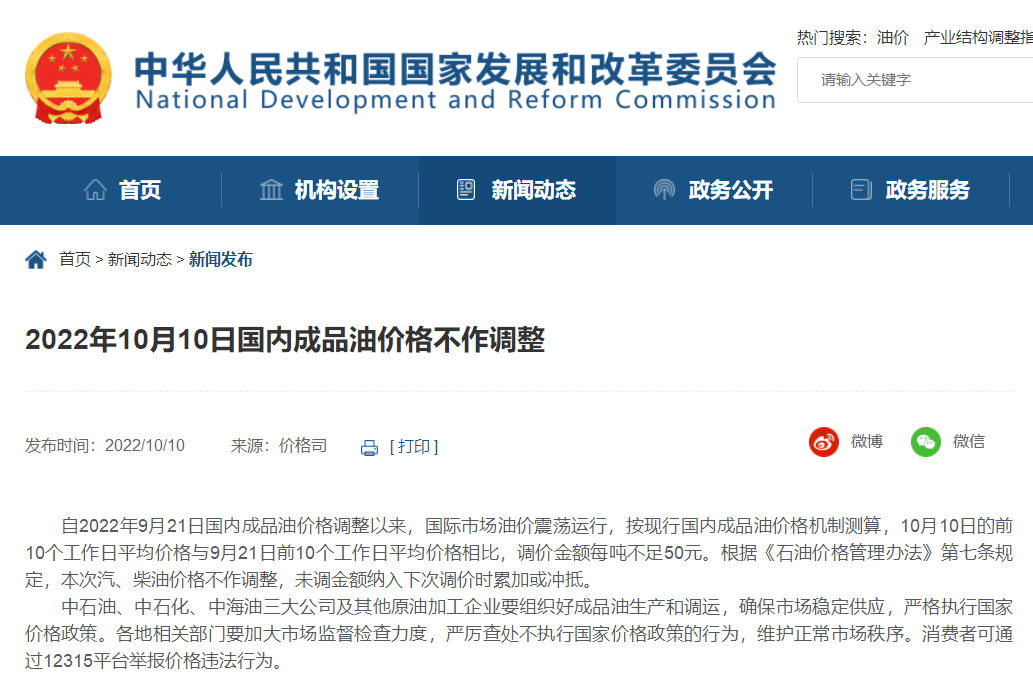 国家发改委网站消息,自2022年9月21日国内成品油价格调整以来,国际市场油价震荡运行,按现行国内成品油价格机制测算,10月10日的前10个工作日平均价格与9月21日前10个工作日平均价格相比,调价金额每吨不足50元。根据《石油价格管理办法》第七条规定,本次汽、柴油价格不作调整,未调金额纳入下次调价时累加或冲抵。