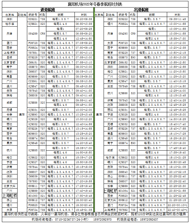 襄阳机场在2022年冬航季换季之时,恢复上海浦东、天津和三亚3个通航点,加密太原⇋襄阳⇋厦门航班至每日一班,优化北京、深圳、广州等多条航班时刻,季中还将新增兰州、大连、桂林航线,助力区域社会经济、文化、旅游的交流和发展。