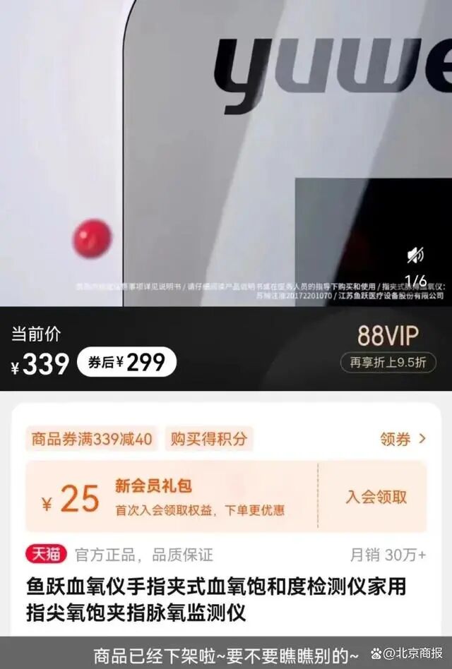 21世纪经济报道记者注意到,已有多名网友在互联网平台发文,爆料鱼跃医疗同款血氧仪价格涨幅翻倍,“去年官网88购物节实际94元到手,最近涨到299元”,引发一系列市场争议。