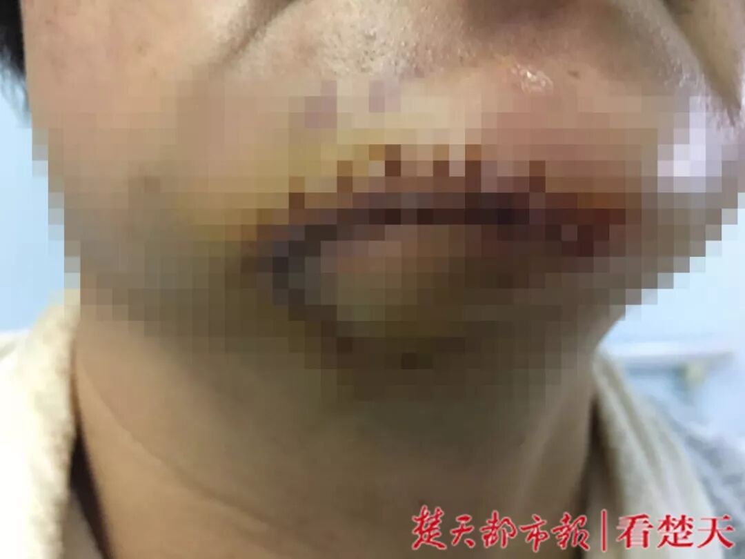 记者看到,付女士头部有两处伤口,其中下颌的伤口缝了15针,她的右臂还有两处伤口。谢先生头顶的两处伤口都缝了针,还没有拆线。