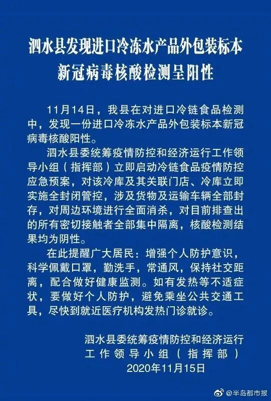 济南市卫健委14日早上通报:11月13日下午5时,济南市疾控中心在盖世物流园区冷库贮存的进口冷冻食品及包装标本中检测出新冠病毒核酸阳性。